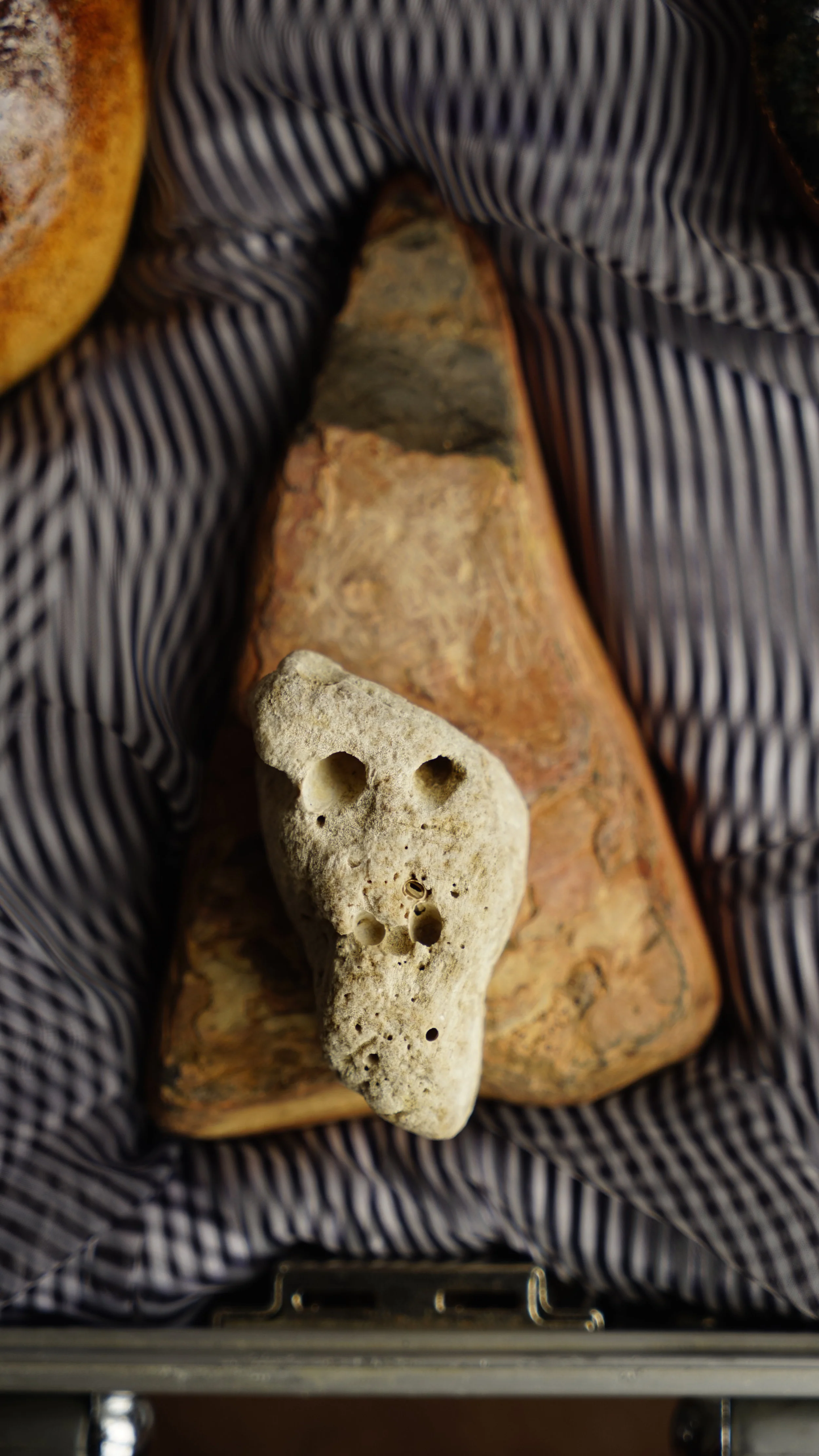Zero Halliburton case, ceramics, glaze, spray paint, coral, clay, rocks, coins, glass, Medusomyces gisevii, digital print on fabric, packaging foam